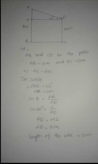 the Class 10 exam syllabus. Information about The tops of two poles of height 16m and 10m are connected by a wire. If the wire makes an angle of60°with the horizontal, then the length of the wire isa)10mb)12mc)16md)18mCorrect answer is option 'B'. Can you explain this answer? covers all topics & solutions for Class 10 2025 Exam.