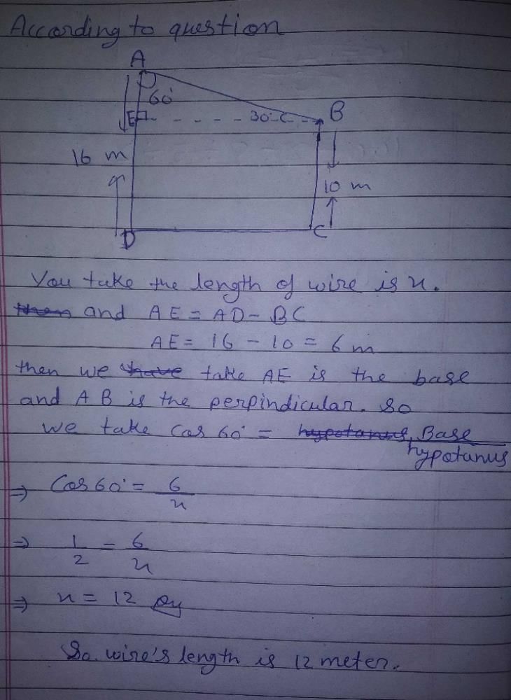 ample number of questions to practice The tops of two poles of height 16m and 10m are connected by a wire. If the wire makes an angle of60°with the horizontal, then the length of the wire isa)10mb)12mc)16md)18mCorrect answer is option 'B'. Can you explain this answer? tests, examples and also practice Class 10 tests.