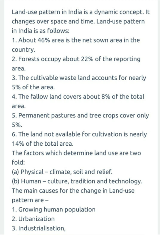 Land use pattern in India refers to the way in which different types of land are used for various purposes such as agriculture, forestry, mining, human settlements, transportation, industries, etc. The land use pattern in India is influenced by various natural, social, economic, and political factors.