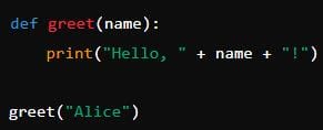 The function `greet("Alice") `prints ` "Hello, Alice!" `.