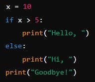 The condition 'x > 5' evaluates to 'True', so it prints ' "Hello, " ' followed by ' "Goodbye!" '.