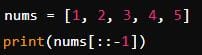 `nums[::-1]` reverses the list `nums`, so it prints `[5, 4, 3, 2, 1]`.