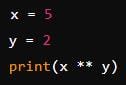 `x ** y` calculates `5` raised to the power `2`, resulting in `25`.
