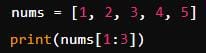 'nums[1:3]' extracts elements from index '1' to '2' (exclusive of index '3'), so it prints '[2, 3]'.