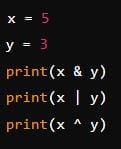 - `x ^ y` performs bitwise XOR (`0101 ^ 0011`), resulting in `0110` which is `6`.