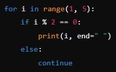 The loop iterates through numbers from '1' to '4'. It prints even numbers ('2' and '4') due to the 'if i % 2 == 0' condition.