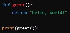 The function `greet()` returns ` "Hello, World!" `which is then printed.