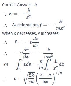 A particle of mass m moves on the x-axis under the influence of a force of attraction towards the origin O, given by . If it starts from rest at a distance 'a' from the origin, the speed attained by it after reaching a point at a distance x will be