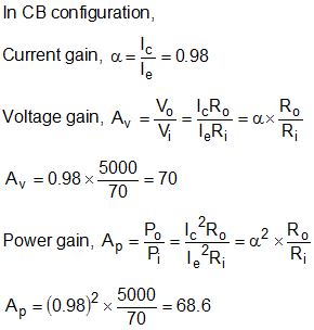A transistor is used as an amplifier in CB mode with a load resistance of 5 kW. The current gain of the amplifier is 0.98 and the input resistance is 70 W. The voltage gain and power gain respectively, are