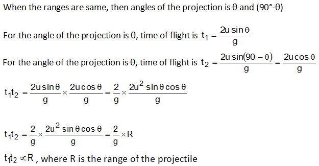 For a given velocity, a projectile has the same range R for two angles of projection. If t1 and t2 are the times of flight in the two cases, then: