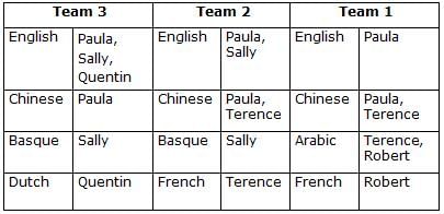 These five people form three teams, Team 1, Team 2 and Team 3. Each team has either 2 or 3 members. A team is said to speak a particular language if at least one of its members speak that language.