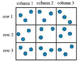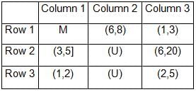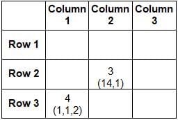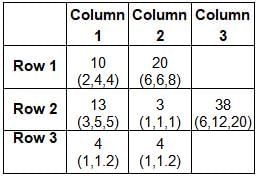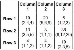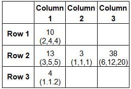 Three pouches (each represented by a filled circle) are kept in each of the nine slots in a 3 × 3 grid, as shown in the figure. Every pouch has a certain number of one-rupee coins. The minimum and maximum amounts of money (in rupees) among the three pouches in each of the nine slots are given in the table. For example, we know that among the three pouches kept in the second column of the first row, the minimum amount in a pouch is Rs. 6 and the maximum amount is Rs. 8.