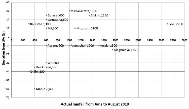 Q. If a ‘Low Monsoon State’ is defined as a state with actual rainfall from June-August, 2019 of 750 mm or less, then what is the median ‘deviation from LPA’ (as defined in the Y-axis of the figure) of ‘Low Monsoon States’?