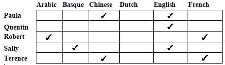 In the table below the check marks indicate all languages spoken by five people: Paula, Quentin, Robert, Sally and Terence. For example, Paula speaks only Chinese and English.