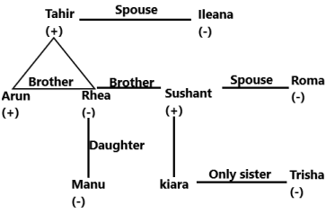In a family of some persons, Sushant says that Manu is the daughter of my sister Rhea, who is the only daughter of Tahir. Arun is the child of Tahir and Ileana, who is the grandmother of Kiara. Roma is the mother of Trisha, who is the only sister of Kiara. Arun is unmarried.
