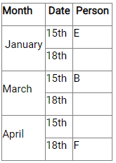(Here, as four people have meeting between E and F, and F did not have meeting on January 15th. So, F will have meeting on April 18th. Two people had meeting between F and B, so B has meeting on March 15th)