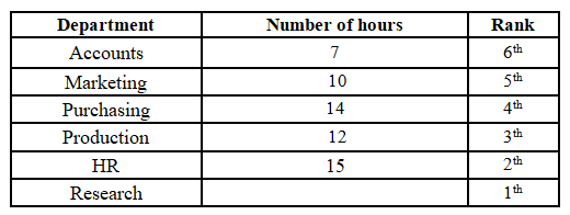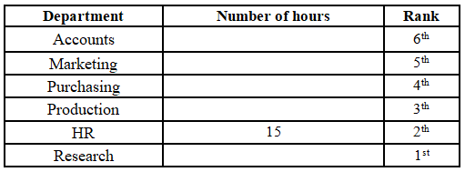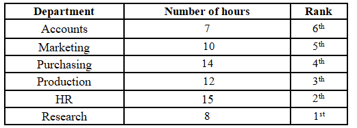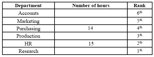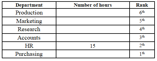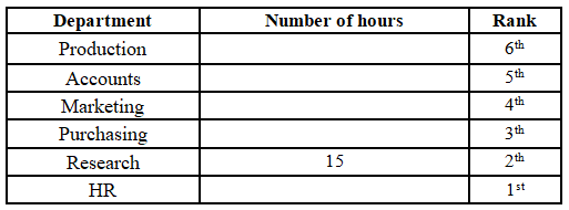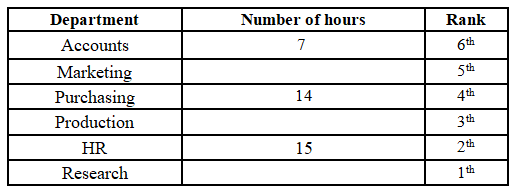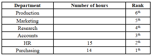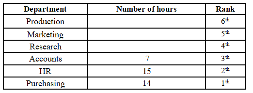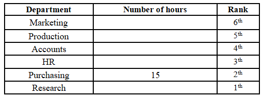 15, which is on rank 2. The person working in the Research department is ranked below the person working in the Production department, and the person working in the Research department works 4 hours less than a person working in the Production department. There is one person in between the person working in the Accounts department and the person working in the Purchasing department. The person working in the Accounts department is above the person working in the Purchasing department, and they work half the number of hours than a person working in the Purchasing department. The person working in the HR department works one hour more than the person working in the Purchasing department. The person working in the Marketing department works 3 hours more than the person working in the Accounts department, but 2 hours less than the person working in the Production department. The top-ranked person does not work for 12 hours.