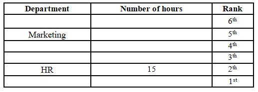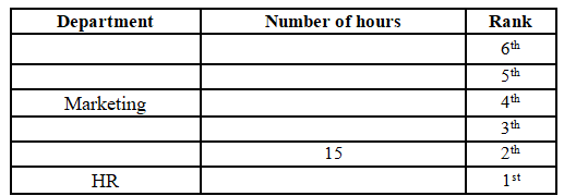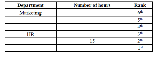 There are two persons in between the person working in the Marketing department and the HR department. The person working in the Marketing department is ranked above the person working in the HR department. The highest number of working hours is 15
