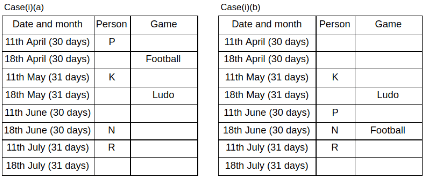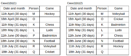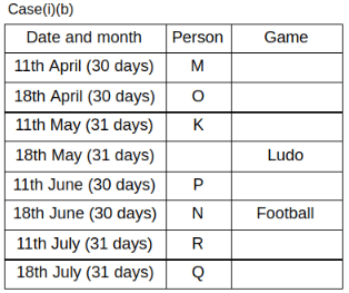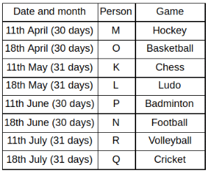 Eight people K, L, M, N, O, P, Q and R got the admission in the college during two different dates 11th and 18th of four different months namely April, May, June and July. Each of them likes different games namely Chess, Hockey, Ludo, Cricket, Football, Badminton, Volleyball and Basketball.