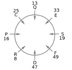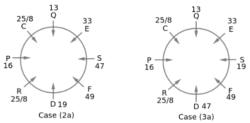Eight people C, D, E, F, P, Q, R and S are sitting around a circular table facing towards the centre with an equal distance between them. Each person is of different ages which are 8, 13, 16, 19, 25, 33, 47 and 49 but not necessarily in the same order. Sum of the ages of R and C is equal to the age of E. Two people sit between C and D. E sits third to the right of the person whose age is prime number. P’s age is not 13. F is not an immediate neighbour of C. Sum of the ages of S and R is less than 42. Two people sit between the persons whose age is 16 and 49. S sits exactly between D and the person whose age is 13. C sits second to the right of E. P sits third to the left of F whose age is 49. D’s age is not 16. D sits opposite to the person whose age is 13. S is not an immediate neighbour of C. The person whose age is 16 sits second to the right of Q.