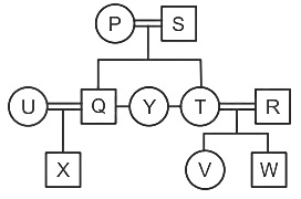 In a family, there are 10 members P, Q, R, S, T, U, V, W, X and Y. There are 5 females in the family. P has only one son. T is sister-in-law of U and R is husband of T. Q is brother of Y. X is grandson of S and son of Q. U is daughter-in-law of P. V is sister of W and cousin of X. S is wife of P and Y is unmarried.T is sister of Y.