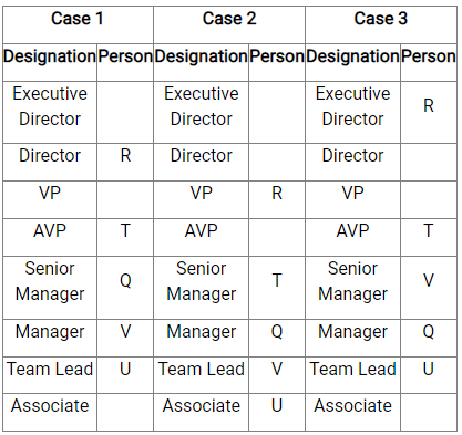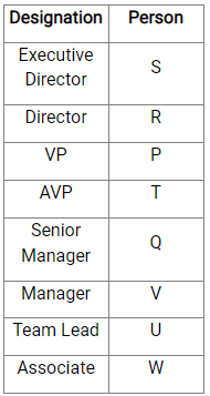 There are eight employees - P, Q, R, S, T, U, V, and W in a company at different designations - Executive Director, Director, VP, AVP, Senior Manager, Manager, Team Lead, and Associate in descending level of seniority. Q is either the Senior Manager or Manager in the company. P is a senior to V who is senior to U. There are two designations between T and U. R is four posts senior to V. P is junior to at least two members in the company. S is senior to W and an equal number of persons are senior to S and junior to W.