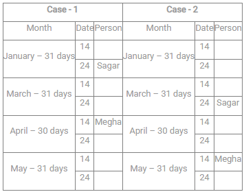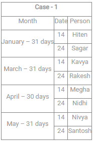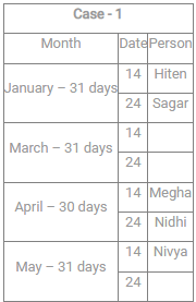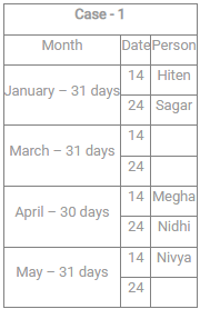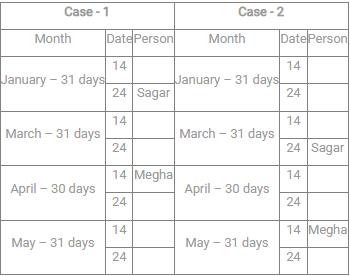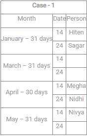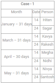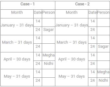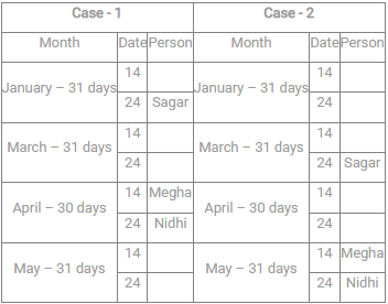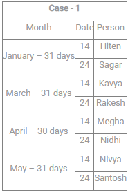There are eight person Sagar, Kavya, Megha, Hiten, Nidhi, Santosh, Rakesh and Nivya who will attend the meeting on either 14th or 24th of January, March, April and May in the same year. No two persons attend the meeting on the same day. Sagar had meeting on the 24th of a month having 31 days and two people had meeting between Sagar and Megha, who did not have meeting before Sagar. Three people had meeting between Sagar and Nidhi. More than four people had meeting between Hiten and Nivya and both of them had meeting on the 14th. Nivya did not attend the meeting before Hiten. Kavya had meeting immediately before Rakesh but not on the 24th of any month. Santosh and Nivya had meeting in the same month.