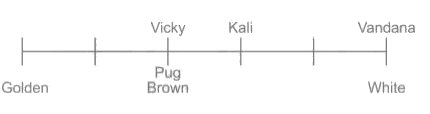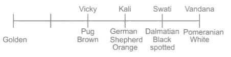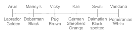 In a dog show, 6 participants presented their dogs. Vicky has a brown color dog standing 3rd from the left. Swati’s dog is a Dalmatian breed and is Black-spotted in color. There is only one Black-spotted dog is standing in between Orange color German shepherd and White color Pomeranian. Candidates who are at extremes have Golden and White color dogs. Vandana is at the right extreme and has a White color dog. Kali is right of Vicky who is having a Pug. Arun is having a Golden Labrador standing adjacent to Manny’s Black Doberman.