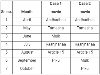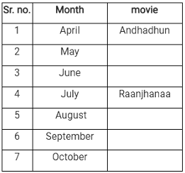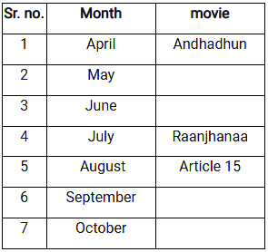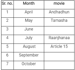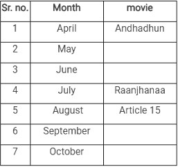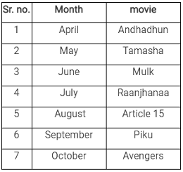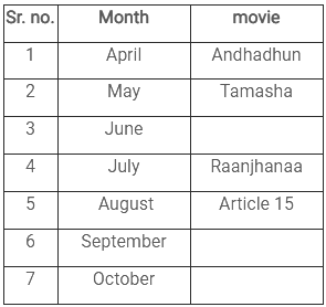 There are 7 movies – Piku, Mulk, Article 15, Avengers, Tamasha, Andhadhun, and Raanjhanaawill release in different months of the year but not necessarily in the same order. No movie will release in the month before April and the month after October.