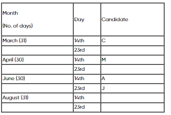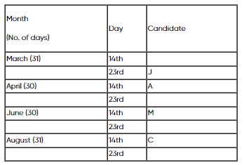A’s enrolled on 14th of the month which has only 30 days. Only three candidates have to enroll between A and C. J and C enrolled neither on the same day nor in the same month. J does not enroll in the month of April. Only two candidates have enrolled dates between J’s and M’s. B’ and M’s enroll dates are same but in different months. K has enrolled on one of the days before B enrolled. Only one person is enrolling between K and L. Less than four candidates have to enroll between L’s and D’s enroll dates.