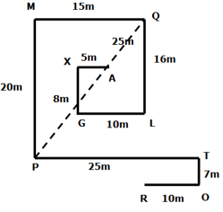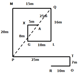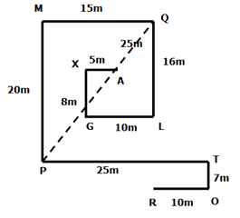 Point Q is 16m north of point L. Point A is 5m east of Point X. Point G is 10m west of point L. Point M is 15m west of point Q. Point X is 8m north of point G. Point T is 7m north of Point O which is 10m east of point R. Point P is 20m south of point M. Point T is 25m east of Point P.
