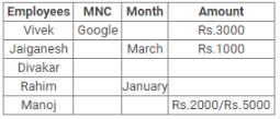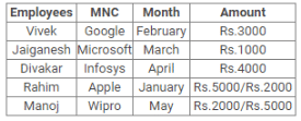 There are five employees namely, Vivek, Jaiganesh, Divakar, Rahim and Manoj and they were born in different months among January to May but not necessarily in the same order. All of them are working in different MNC’s like Infosys, Microsoft, Wipro, Apple and Google. All of them are withdrawn different amount from ATM like Rs.1000 to Rs.5000 in consecutive multiples of Rs.1000 but not necessarily in the same order.