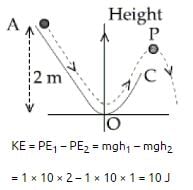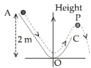 A particle (m = 1 kg) slides down a frictionless track (AOC) starting from rest at a point A (height 2 m). After reaching C, the particle continues to move freely in air as a projectile. When it reaches its highest point P (height 1 m), the kinetic energy of the particle (in J) is....