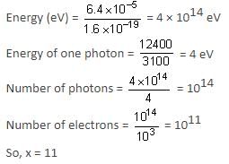 A beam of electromagnetic radiation of intensity 6.4 × 10-5 W/cm2 is comprised of wavelength, λ = 310 nm. It falls normally on a metal (work function ϕ = 2eV) of surface area of 1 cm2. If one in 103 photons ejects an electron, then total number of electrons ejected in 1s is 10x. (hc = 1,240 eVnm, 1 eV = 1.6 × 10-19 J). Then, x is