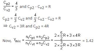 2 moles of an ideal gas with CP/CV = 5/3 are mixed with 3 moles of another ideal gas with CP/CV = 4/3. The value of CP/CV for the mixture is? (Answer upto 2 decimal places)