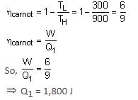 A Carnot engine operates between two reservoirs of temperatures 900 K and 300 K. The engine performs 1,200 J of work per cycle. The heat energy (in J) delivered by the engine to the low temperature reservoir, in a cycle, is
