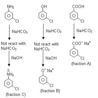A solution of m-chloroaniline, m-chlorophenol and m-chlorobenzoic acid in ethyl acetate was extracted initially with a saturated solution of NaHCO3 to give fraction A. The leftover organic phase was extracted with dilute NaOH solution to give fraction B. The final organic layer was labelled as fraction C. Fractions A, B and C respectively contain: