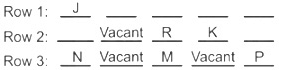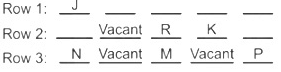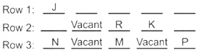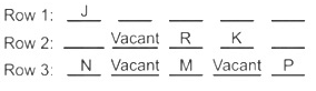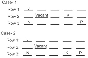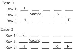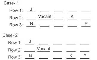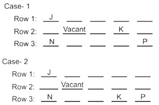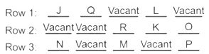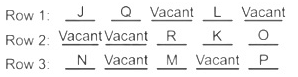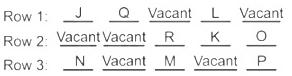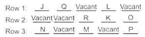 M is sitting immediately behind R. L sits between two vacant seats. P and J are diagonally opposite to each other. O is sitting behind one of the vacant seats from row one. M, and N are sitting in the same row but not adjacent to each other. In row 2, the second seat from the left is vacant. The number of vacant seats between Q and L are the same as vacant seats between N and M. J is sitting two rows in front of N. K is behind the person, who is third to the right of J. P is not sitting in Row-2.
