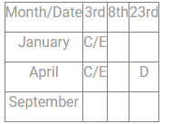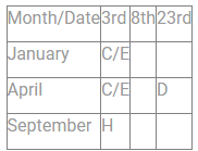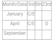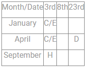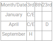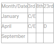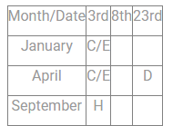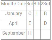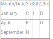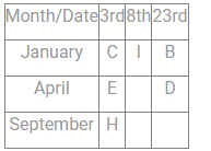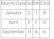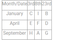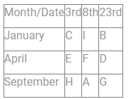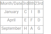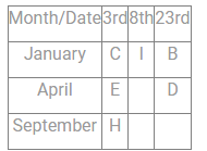 Nine people – A, B, C, D, E, F, G, H, and I, visited the dentist in three months namely, January, April, and September, on three different dates, 3rd, 8th, and 23rd of the months, but not necessarily in the same order. No two person visited the dentist on the same day of the same month.