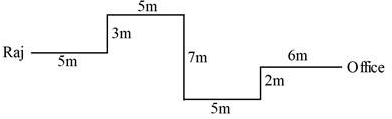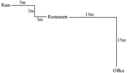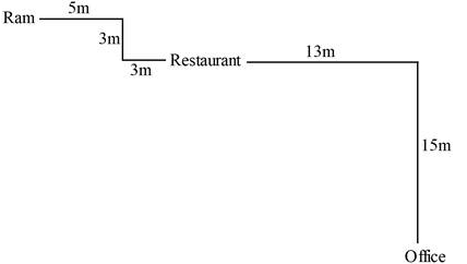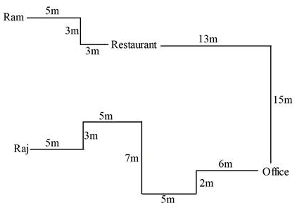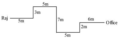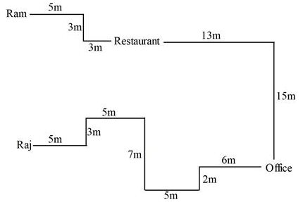 Directions: Ram and Raj are friends and they are working in the same office. Raj who is facing north started from his house and walked 5m towards right. He turns left and walked 3m then he takes right and walked 5m. Again, he turns right and walked 7m and turns left and walked 5m. Finally, he turns left and walked 2m and turns right and walked 6m to reach his office. Ram who is facing north started from his house and walked 5m towards right. He turns right and walked 3m and turns left and walked 3m to reach the Restaurant. Now he walked 13m towards east from the Restaurant. Finally, he takes right and walked 15m to reach his office.