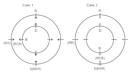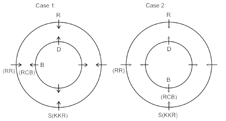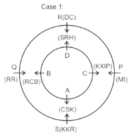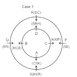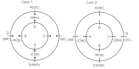 Eight friends A, B, C, D, P, Q, R and S are sitting in two circles in such a manner that each member of the inner circle sits exactly opposite to the member of the outer circle. The members sitting in the outer circle are P, Q, R and S and all of them are facing towards the Centre while the members of the inner circle are A, B, C and D and they are facing away from the Centre. Each of them likes different IPL teams DC, RCB, MI, CSK, KXIP, SRH, KKR and RR but not necessarily in the same order.