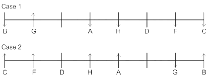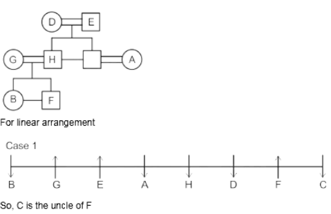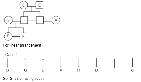 G and H do not face same direction. D sits 2nd to the left of A and 2nd to the right of C as well. E and his grandson face same direction. The son of H faces opposite direction to his grandmother but same direction as his mother. B is youngest female member of the family who sits on one of the ends of the line. G faces the opposite direction to her daughter. D is married to E and they have only two sons. H is father of F who sits 2nd to the left of H and faces north direction. A is the aunt of B and sits 3rd to her left. A faces same direction as B. G and H are married couples and two people sit between them. F is the grandson of D who is the mother of C. F is not immediate neighbor of A.