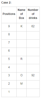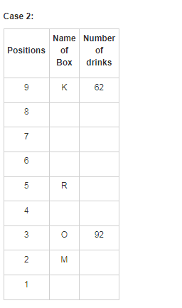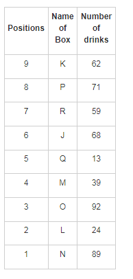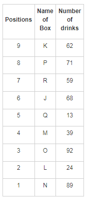 There are nine boxes from J, K, L, M, N, O, P, Q and R which are placed one above the other. Each box has a different number of drinks such as 71, 24, 68, 89, 39, 59, 62, 92 and 13. The lowermost box is numbered as one and above as two and so on. All the above information is not necessary in the same order.