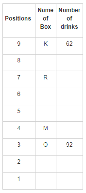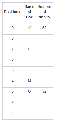 Q. How many boxes are kept between box R and the box that has 92 drinks?