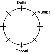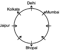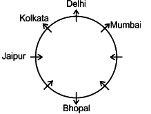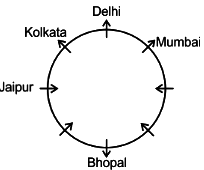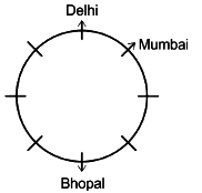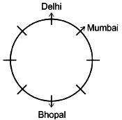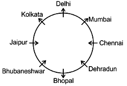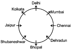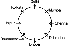 The person from Delhi faces outward and sits at the immediate left of the person from Mumbai who faces outward. The person sitting third to the right of the person from Mumbai comes from Bhopal and faces the same direction as him. The person sitting adjacent to the person from Delhi and the person from Jaipur comes from Kolkata and faces outward. The person sitting at the immediate right of the person from Bhopal comes from Bhubaneswar. The person between the person from Bhopal and the person from Chennai come from Dehradun.