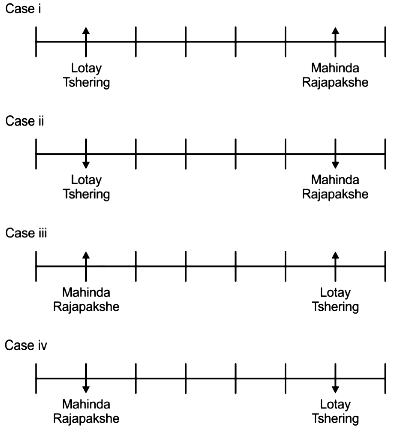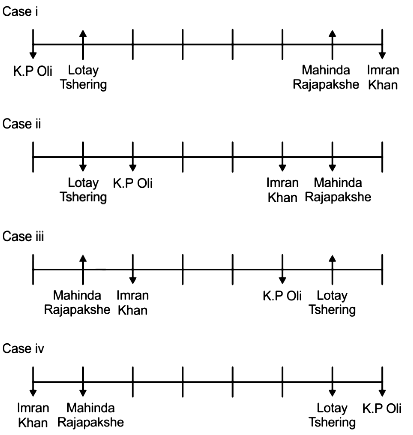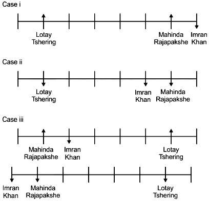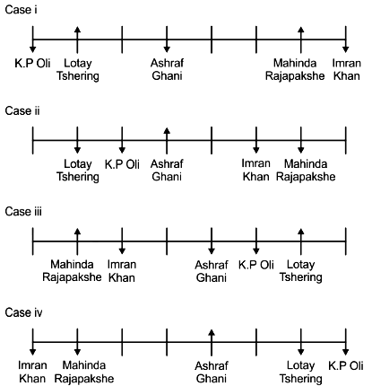 There are four leaders sitting between Mahinda Rajapakshe and Lotay Tshering and both of them are facing the same direction and neither of them are sitting at the extreme end of the row. Imran Khan who is facing south is sitting to the immediate right of Mahinda Rajapakshe. K P Oli who is facing south is sitting to the immediate left of Lotay Tshering. Two leaders are sitting between Ashraf Ghani and Mahinda Rajapakshe and Ashraf Ghani is facing direction opposite to Mahinda Rajapakshe. Three leaders are sitting between Narendra Modi and Aung San Su Kyi and Narendra Modi is not the immediate neighbour of Imran Khan and Ashraf Ghani. The immediate neighbours of Ashraf Ghani are facing opposite direction (that is if one leader is facing south the other leader will be facing north and vice versa). Imran Khan is sitting second to the right of Xi Jinping.