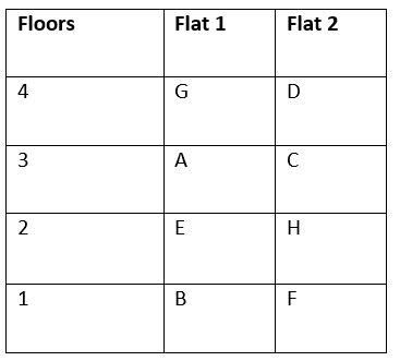 Eight people are A, B, C, D, E, F, G, and H living in a building which has four floors numbered as 1 to 4 from bottom to top. Each floor has two flat 1 and flat 2, where flat 2 is to the east of flat 1. Only one person is living in each flat of the building but not necessarily in the same order