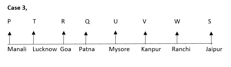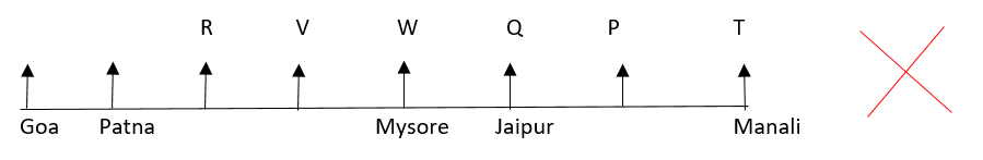 Eight people, viz P, Q, R, S, T, U, V, and W are sitting in a straight line facing North. Each of them belongs to different cities, viz Patna, Ranchi, Kanpur, Lucknow, Goa, Manali, Mysore, and Jaipur but not necessarily in the same order.