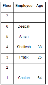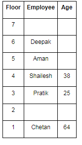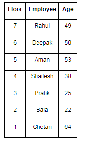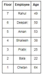 There are seven employees Aman, Bala, Chetan, Pratik, Deepak, Rahul and Shailesh. They live on seven different floors of a building. The Lowermost floor is numbered as 1 and the topmost floor is numbered as seven. They are of different age i.e. 22, 49, 64, 25, 38, 50 and 53 but not necessarily in the same order. Deepak is three years younger than Aman. Pratik lives immediately below the one who is 38 years old and his age is perfect square as well as divisible by 5. Rahul lives on an odd-numbered floor and his age is a perfect square. Shailesh who is the third youngest person lives on the fourth floor. Deepak lives just above Aman but not on the second floor. Chetan lives on an odd-numbered floor and his age is a perfect cube. Aman does not live on an even number floor. The one who is the oldest does not live on the top floor.