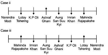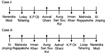 Eight leaders Narendra Modi, Imran Khan, Ashraf Ghani, Lotay Tshering, K P Oli, Xi Jinping, Mahinda Rajapakshe and Aung San Suu Kyi are sitting in a row. Four leaders are facing north and four learders are facing south. The leaders sitting at the end of the row are facing opposite direction (that is if one leader is facing south then the other leader will be facing north and vice versa).